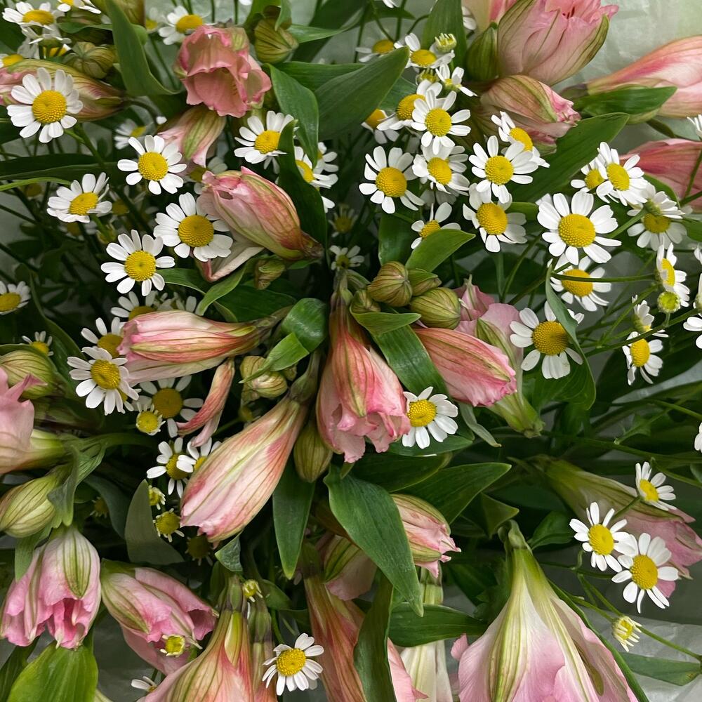 Альстромерия – 9 шт.Матрикария – 6 шт.Упаковка дизайнерская – 1 шт.Лента атласная – 1 шт.