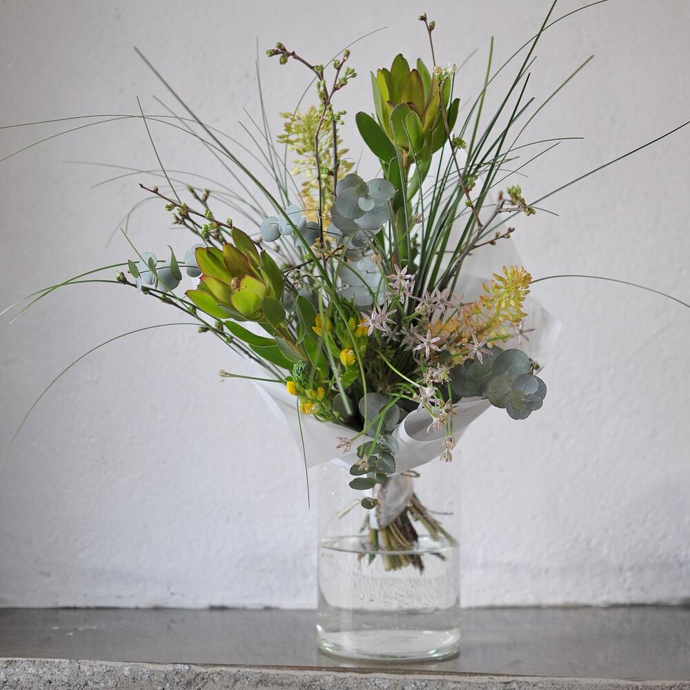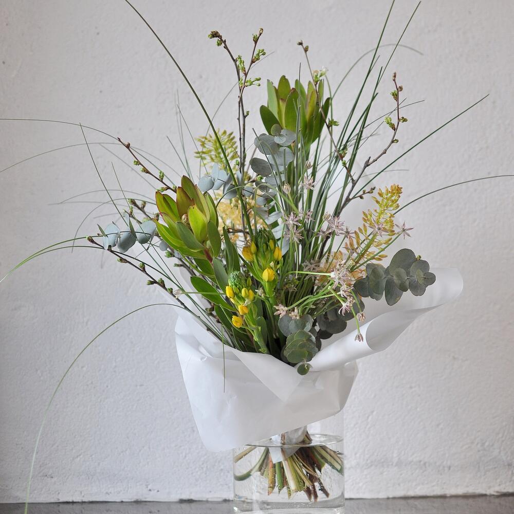 леукондендрон – 2 шт.Орнитогалум – 2 шт.Эвкалипт – 4 шт.Прунус – 3 шт.Берграсс – 3 шт.эремурус – 2 шт.Упаковка – 1 шт.Лента атласная – 1 шт.