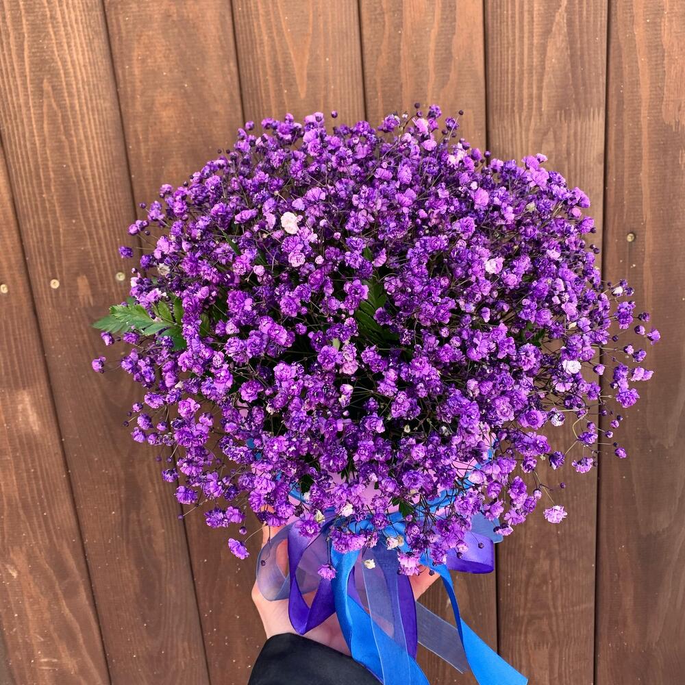 Букет из фиолетовой гипсофилы в шляпной коробке