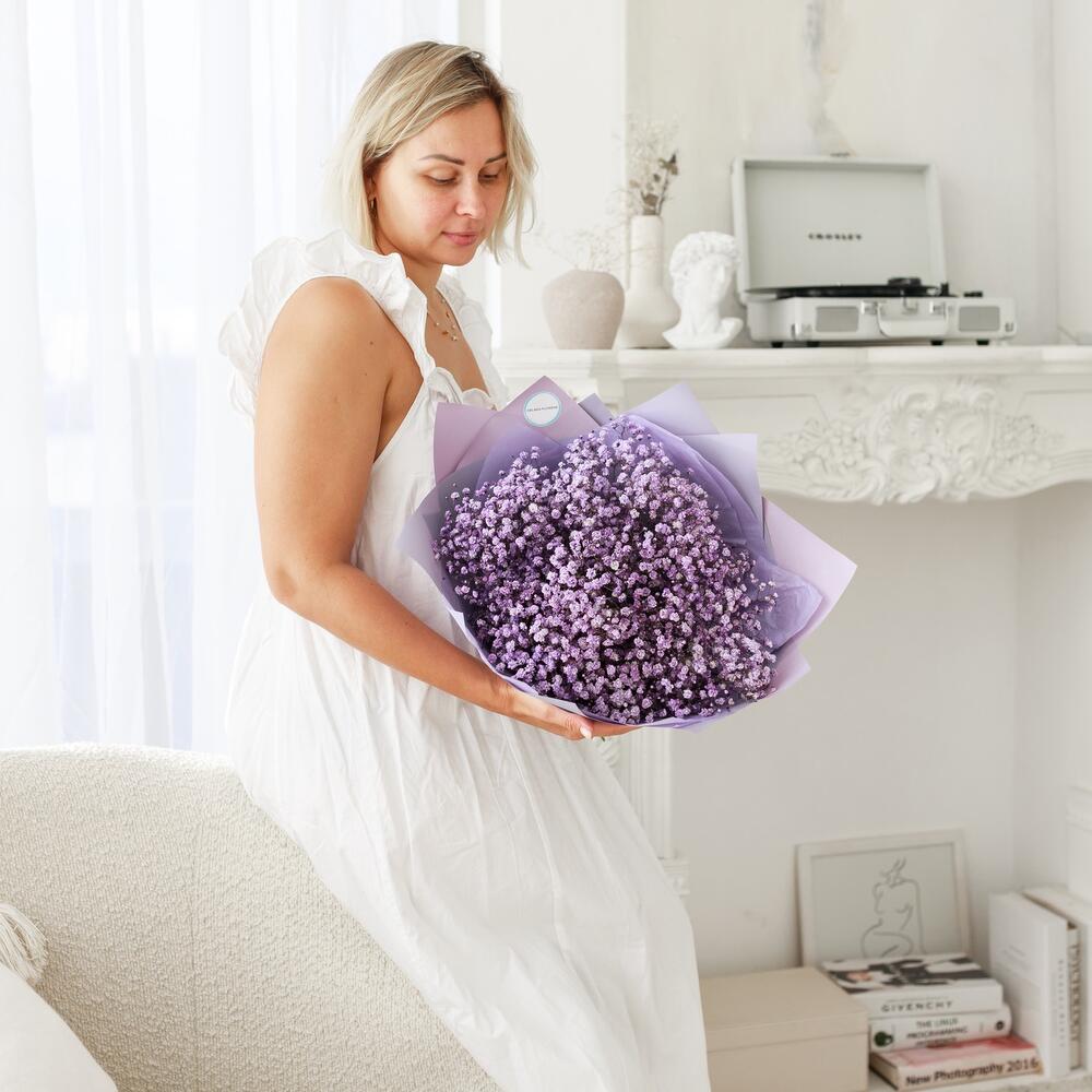 Очаровательный букет из воздушной гипсофилы. Ни одна дама, точно не останется равнодушной при виде такого букета .Инструкция по уходу за цветами прикреплена к каждому заказу.Цветы гипсофилы отличаются стойкостью и даже при высыхании не теряют, декоративности и цвета. Что позволяет, долгое время украшать интерьер в качестве сухоцветов.Подпишем открытку с вашими пожеланиями бесплатно