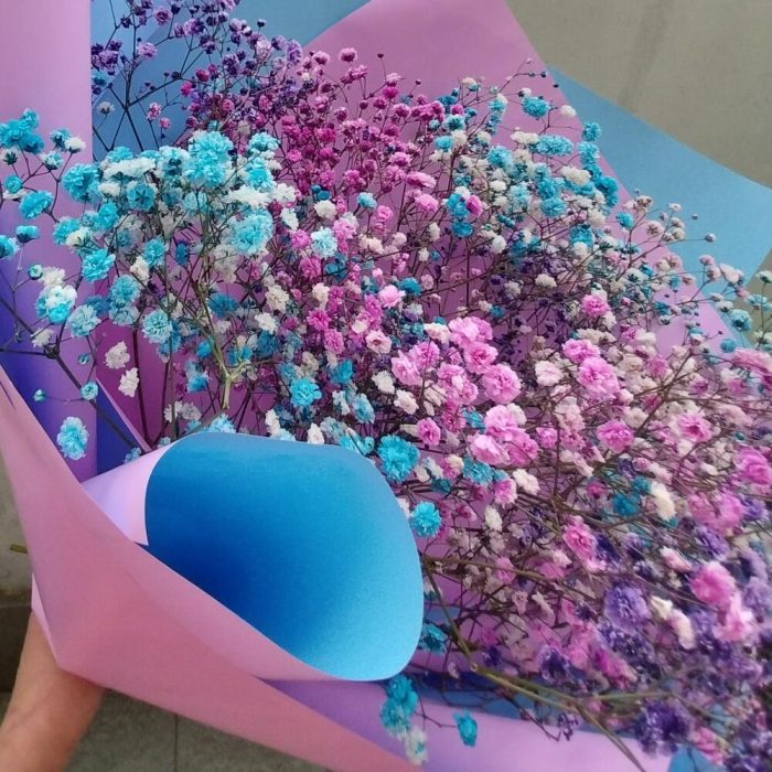 Лента – 1 шт.Упаковка дизайнерская – 7 шт.гипсофила радужная – 9 шт.