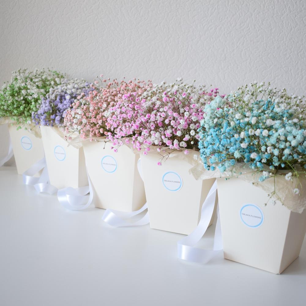 Гипсофила – 5 шт.Сумочка с ручками из плотного картона ламинированого – 1 шт.Губка флористическая – 1 шт.