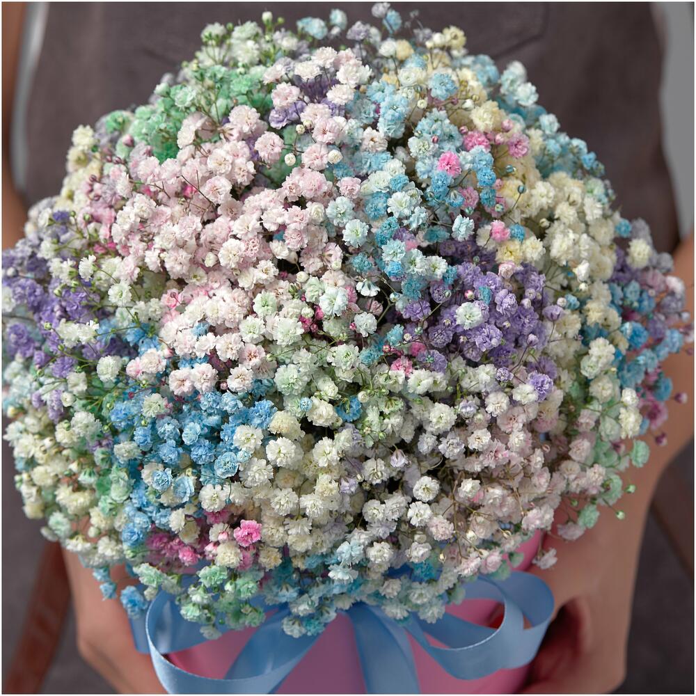 гипсофила радужная эквадор – 45 шт.Шляпная коробка – 1 шт.Оазис флористический – 1 шт.Лента атласная – 1 шт.любовь флориста (бесплатно) – 1 шт.инструкция по уходу за цветами – 1 шт.