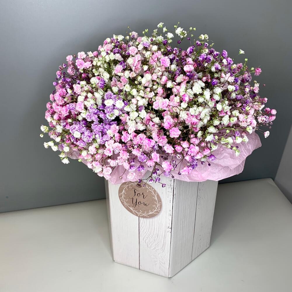 гипсофила радужная – 9 шт.Коробка шляпная – 1 шт.Оазис флористический – 1 шт.Тишью – 2 шт.Пленка прозрачная – 1 шт.Лента атласная – 2 шт.
