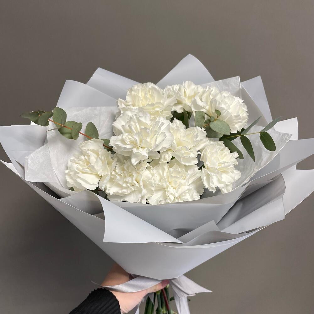 Эвкалипт – 3 шт.Тишью – 2 шт.Пленка матовая – 2 шт.Диантус белый – 9 шт.