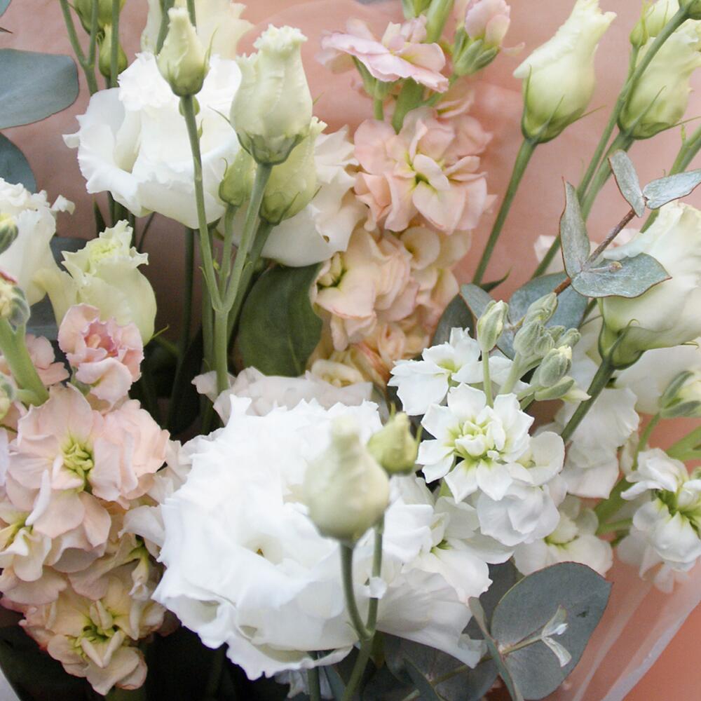 Лизиантус – 3 шт.Маттиола – 4 шт.Эвкалипт – 1 шт.Тишью – 1 шт.Атласная лента – 2 шт.Матовая пленка – 1 шт.