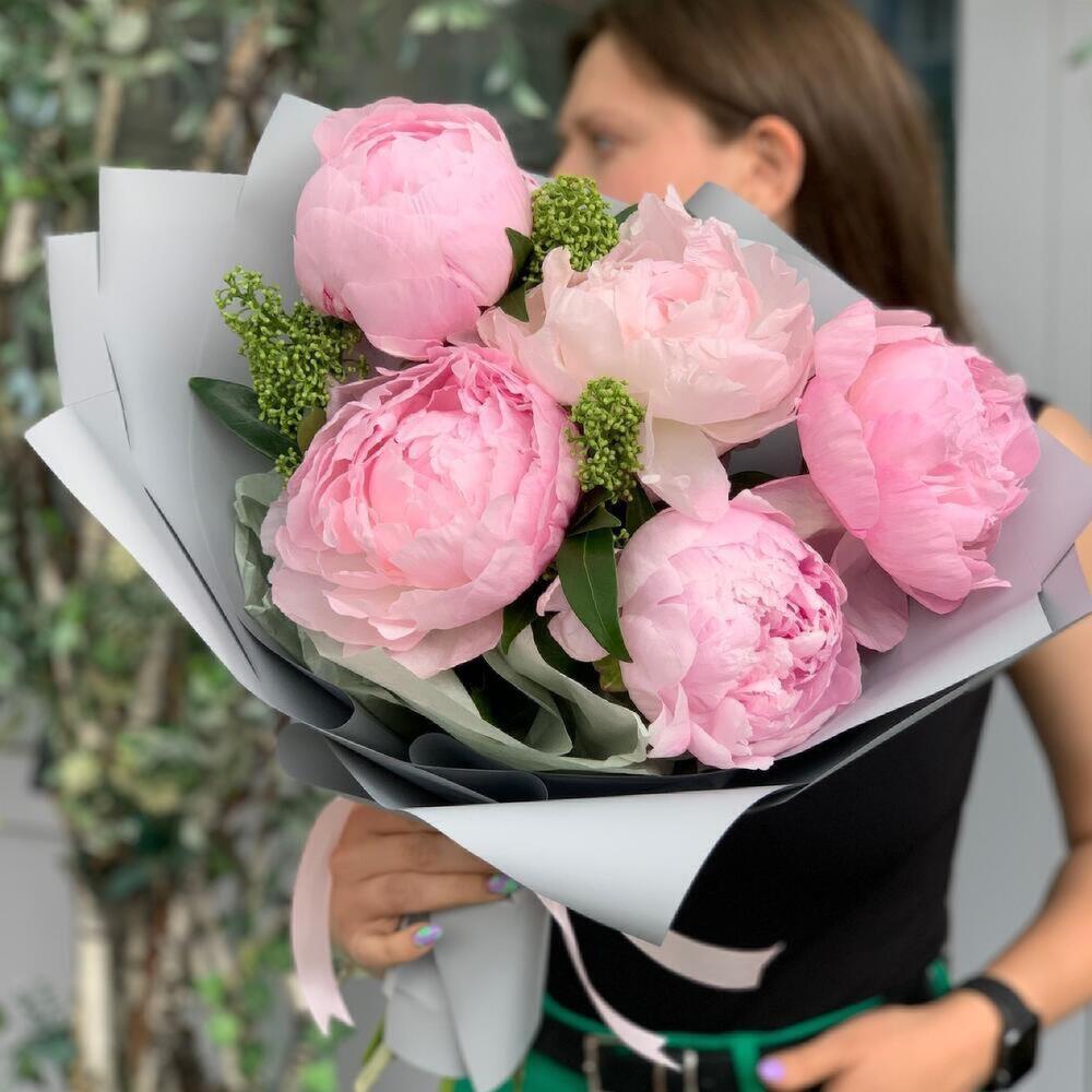 Пион розовый – 5 шт.декоративная зелень – 5 шт.Упаковка дизайнерская – 1 шт.Лента атласная – 2 шт.Открыточка с вашими пожеланиями – 1 шт.хорошее настроение – 100 шт.инструкция по уходу за цветами – 1 шт.коробка переноска – 1 шт.Кризал – 1 шт.