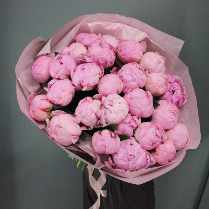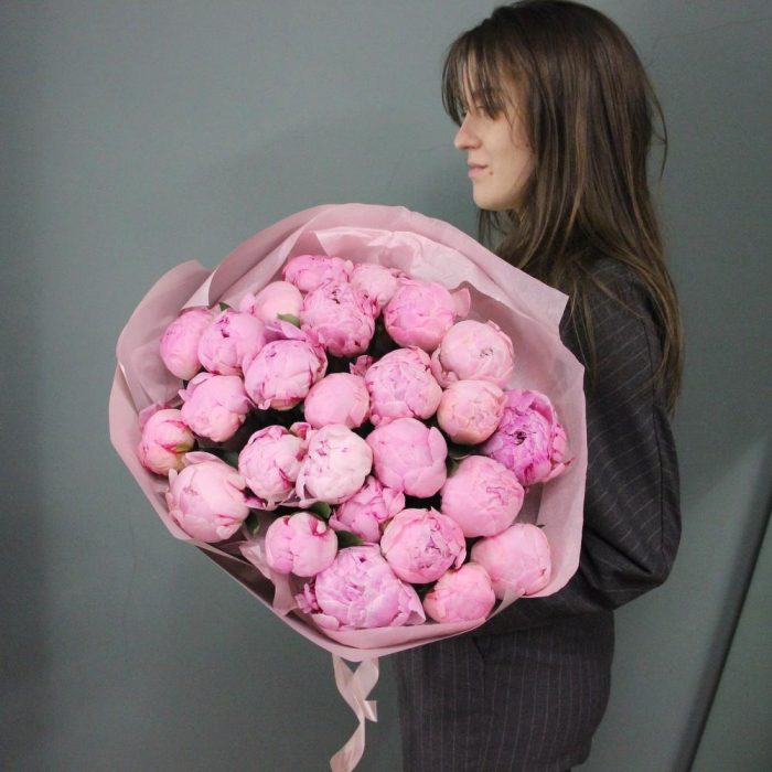 Букет из 25 пионов в лаконичной упаковке.Стильное цветочное решение для любого случая.