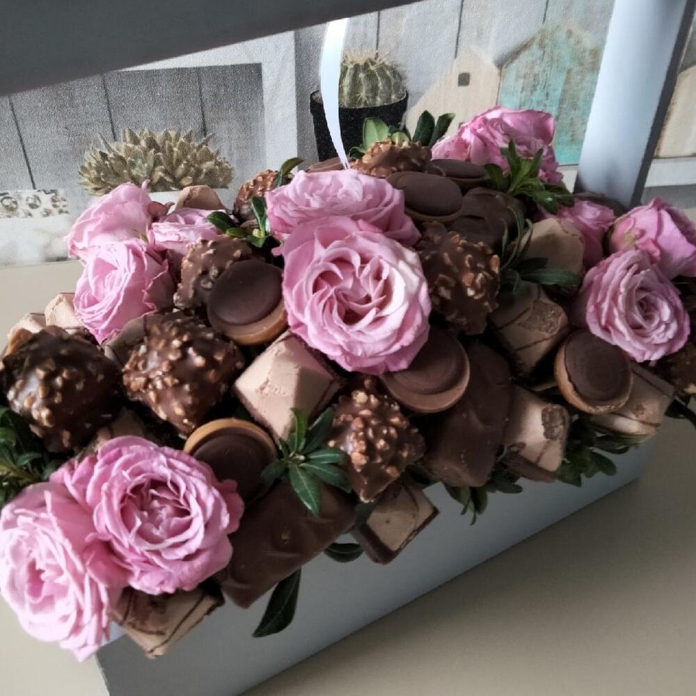 Роза кустовая – 1 шт.Шоколадные конфеты – 300 гр.Тоффифи – 15 шт.Сникерс мини – 10 шт.натуральная зелень – 1 шт.Ящик деревянный – 1 шт.