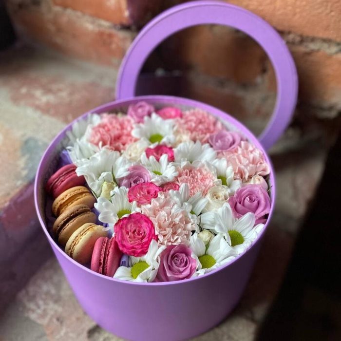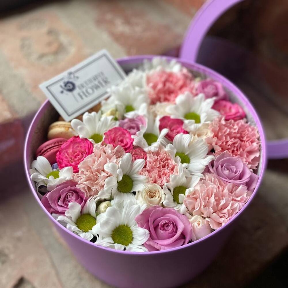 Макарон – 5 шт.Коробка – 1 шт.Хризантема кустовая – 2 шт.Диантус – 5 шт.Роза кустовая – 2 шт.Роза – 5 шт.