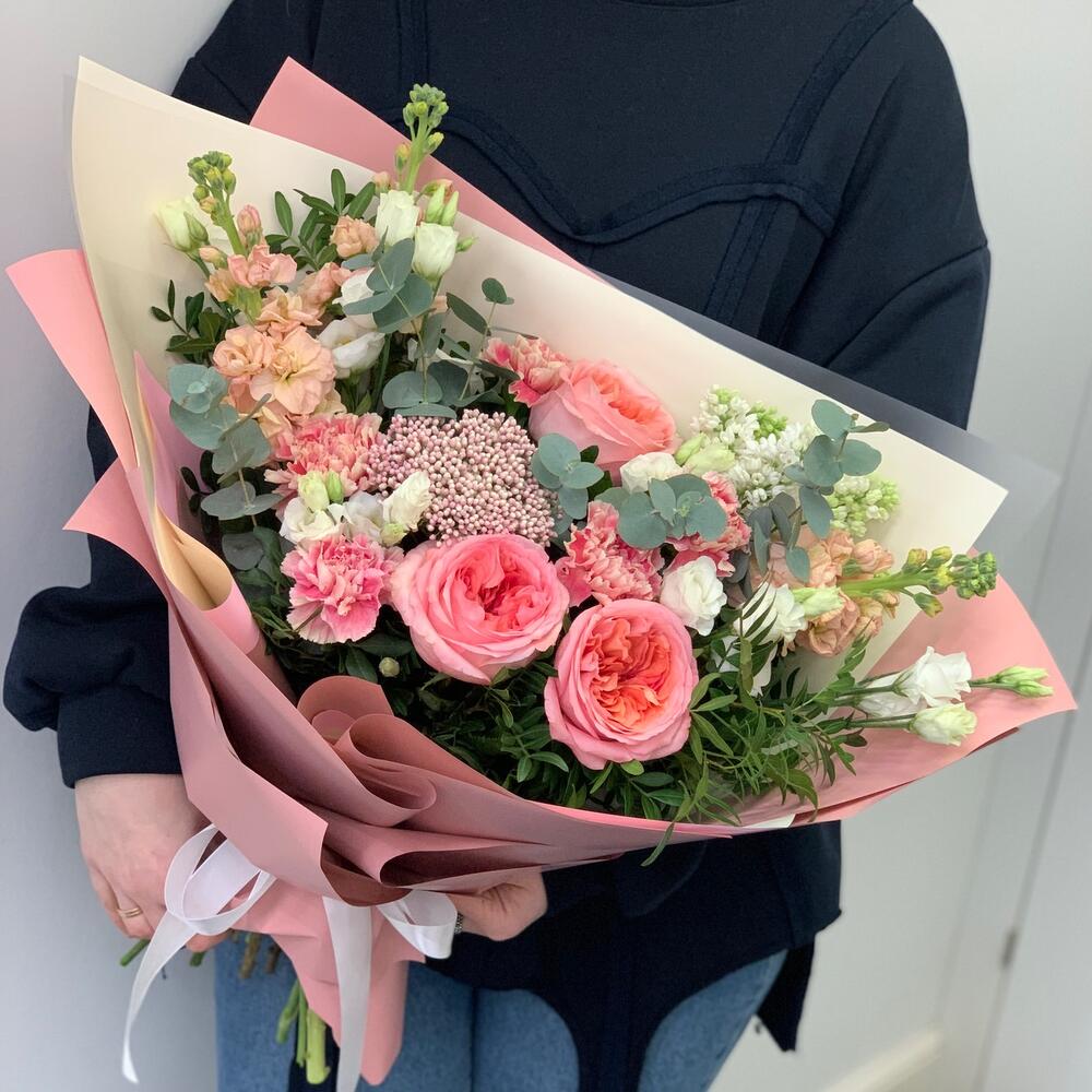 Сирень – 1 шт.Озотамнус – 1 шт.Гвоздика – 5 шт.Роза – 3 шт.Лизиантус – 2 шт.эвколиптом – 1 шт.Зелень – 3 шт.левкое – 3 шт.Дизайнерская упаковка – 3 шт.