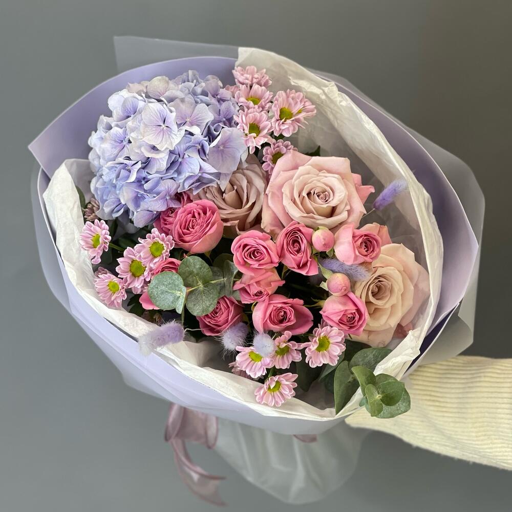 Гортензия – 1 шт.Лента – 1 шт.Роза кустовая – 2 шт.Хризантема Сантини – 3 шт.Эвкалипт – 1 шт.Роза одноголовая – 3 шт.Тишью – 1 шт.Упаковка дизайнерская – 1 шт.Лагурус – 6 шт.
