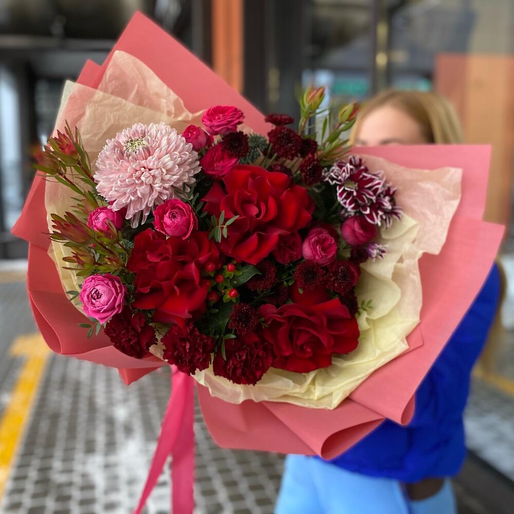 Роза Эквадор – 3 шт.Роза кустовая – 3 шт.Гвоздика – 3 шт.Сантини – 3 шт.магнум – 1 шт.леукондендрон – 2 шт.Хризантема кустовая – 1 шт.