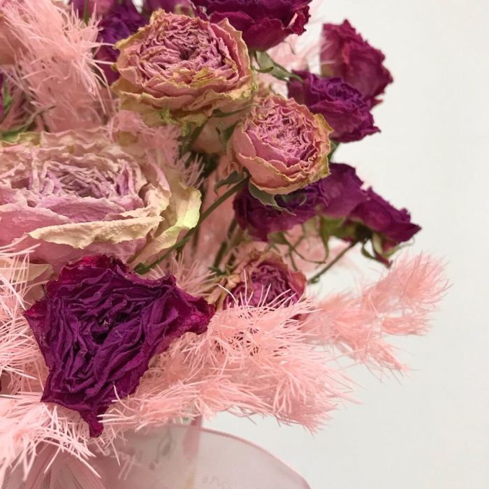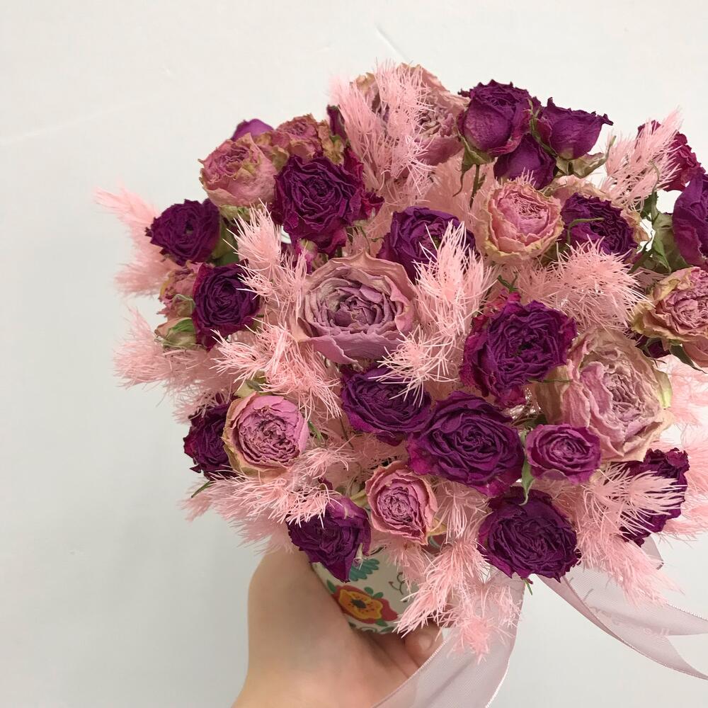 роза кустовая засушенная – 7 шт.аспарагус стабилизированный – 3 шт.Оазис флористический – 1 шт.стакан кофейный пластик – 1 шт.Лента атласная – 1 шт.