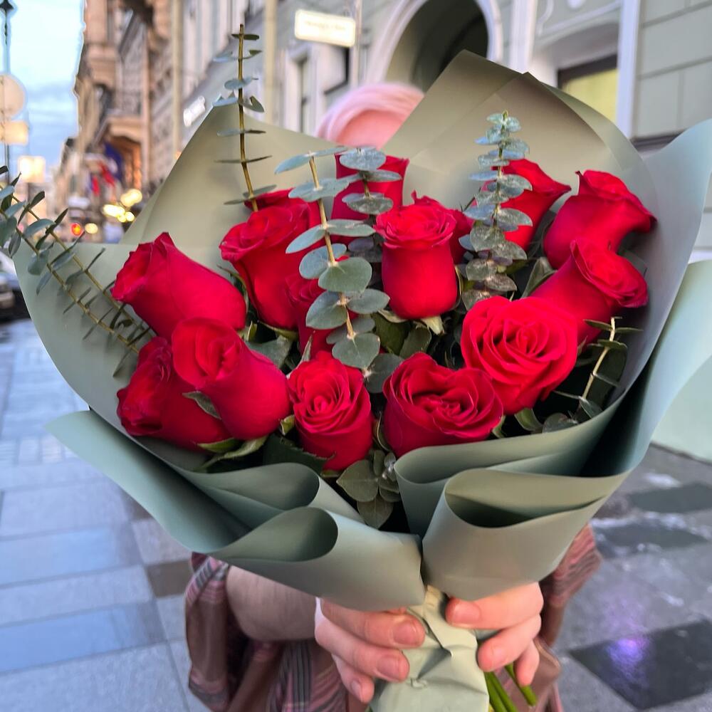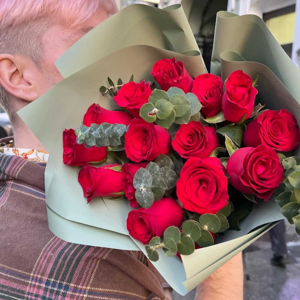 Эвкалипт – 5 шт.Лента атласная – 1 шт.Упаковка корейская пленка – 1 шт.роза кения красная – 15 шт.