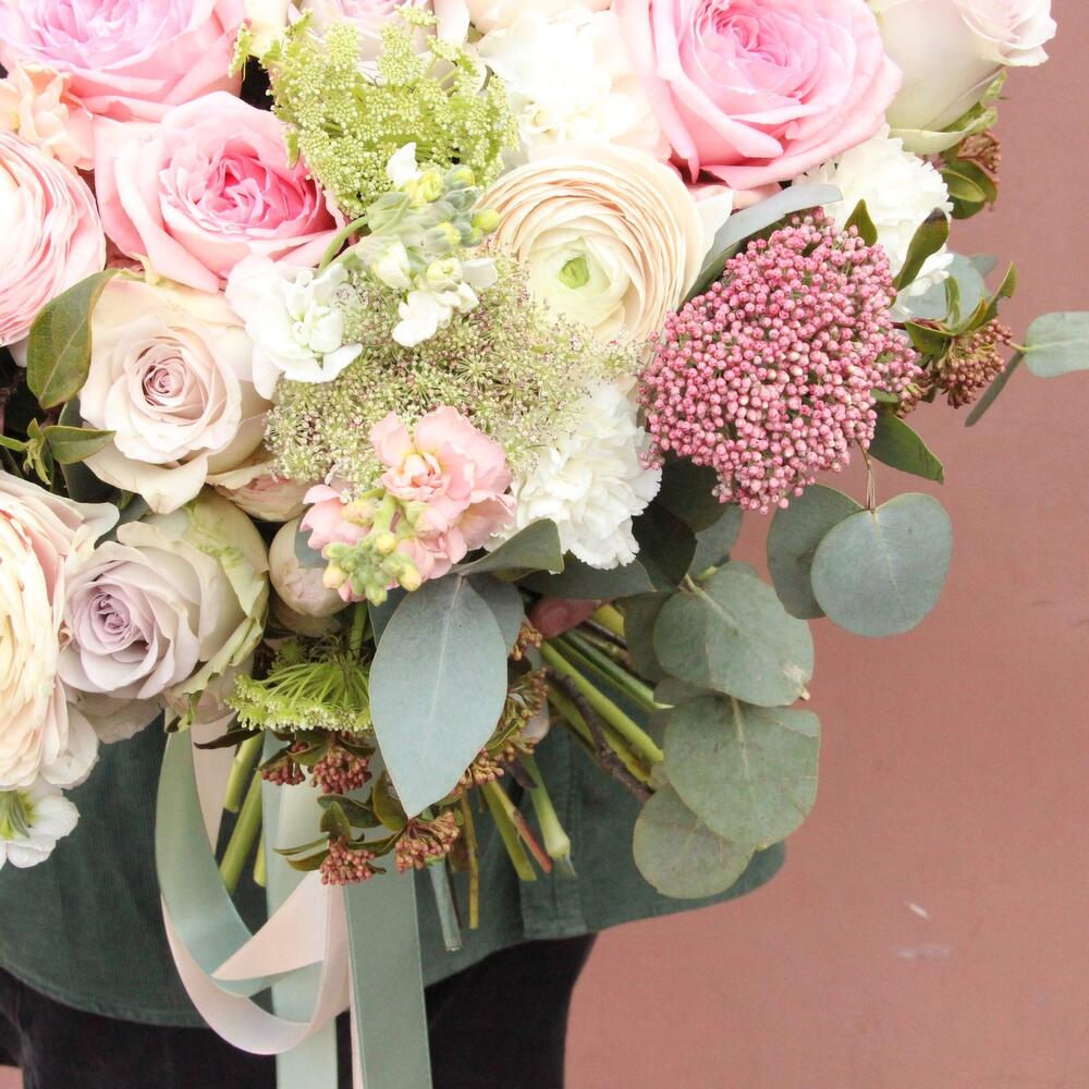 Садовый, авторский букет с ранункулюсами, пионовидными розами, амми, душистой маттиолой и эвкалиптом.