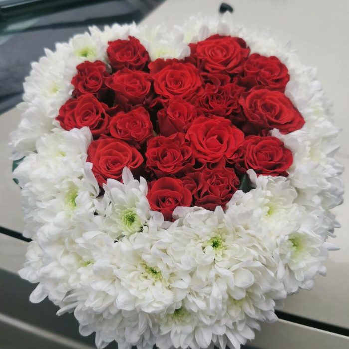 Яркое сердце из 17 красных роз и 4 веток белоснежной хризантемы. Очень нежный и привлекательный букет в форме сердца.