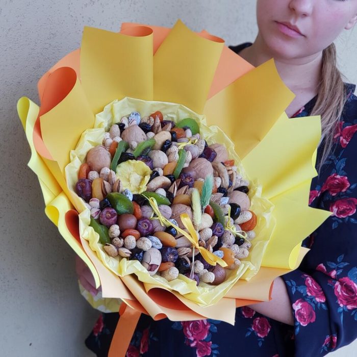 Орехи грецкие – 100 гр.орехи пекан – 30 гр.Орехи фундук – 25 гр.Фисташки – 15 гр.орехи миндаль – 30 гр.орехи макадамия – 20 гр.абрикос соленый косточка – 13 гр.арахис в скорлупе – 50 гр.ананас вяленый – 15 гр.Финики – 100 гр.Курага – 100 гр.Дыня – 40 гр.Чернослив – 50 гр.Инжир – 35 гр.Киви – 70 гр.Лагурус – 2 шт.коробка транспортировочная – 1 шт.