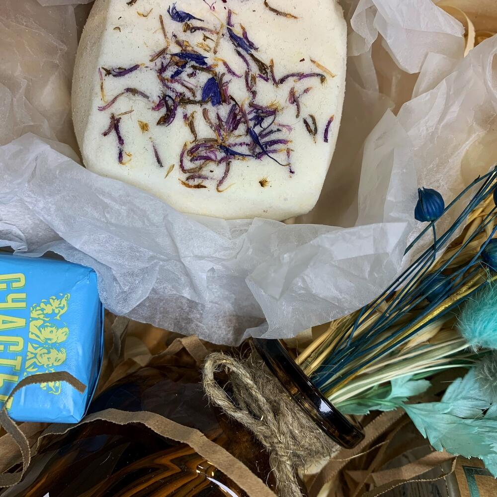 Ящик деревянный ручной работы – 1 шт.Ваза стекло – 1 шт.букет из сухоцветов – 1 шт.свеча banca home в ассортименте – 1 шт.бомбочка для ванной ручной работы с натуральными маслами – 1 шт.конфеты счастье 50г – 2 шт.