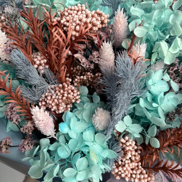 Лаванда – 13 шт.Лимониум – 2 шт.Озотамнус – 2 шт.Аспарагус – 1 шт.Упаковка дизайнерская – 1 шт.Овес – 5 шт.чайное дерево – 2 шт.гортензия стабилизированная – 1 шт.пароротник – 1 шт.Фаларис – 11 шт.