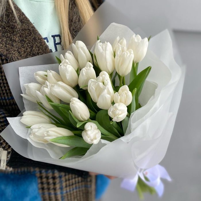 Лента атласная – 2 шт.Тишью – 2 шт.Упаковка дизайнерская – 4 шт.тюльпаны белые – 25 шт.