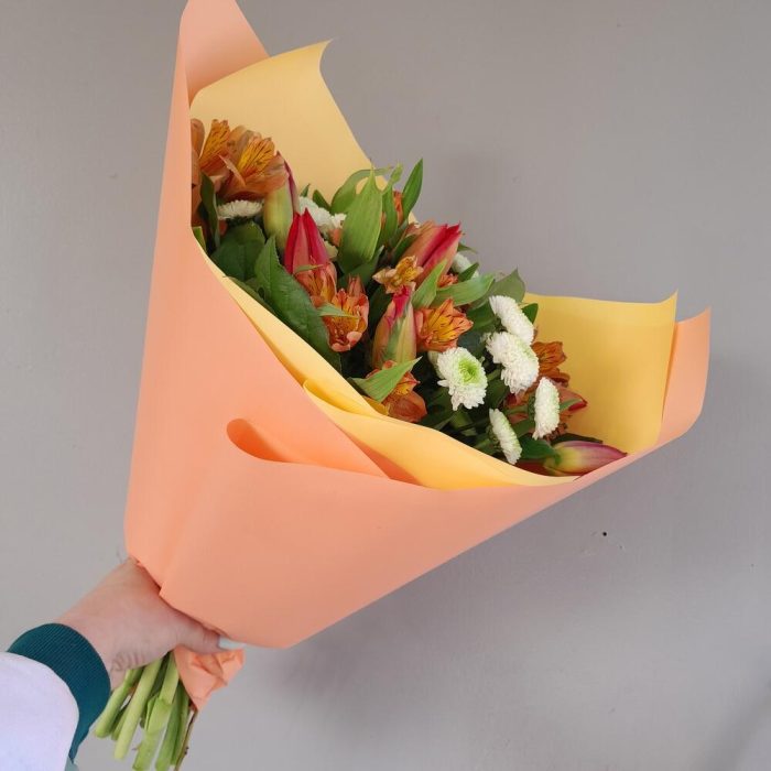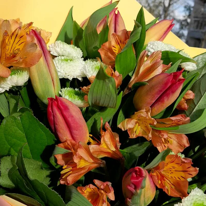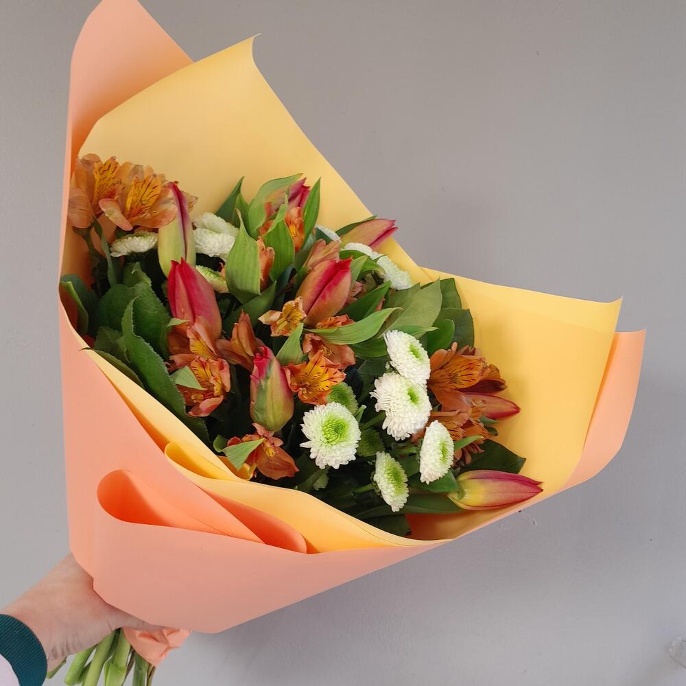 Альстромерия – 7 шт.Салал – 3 шт.Тюльпан – 9 шт.Лента атласная – 2 шт.Сантини – 3 шт.Упаковка дизайнерская – 3 шт.