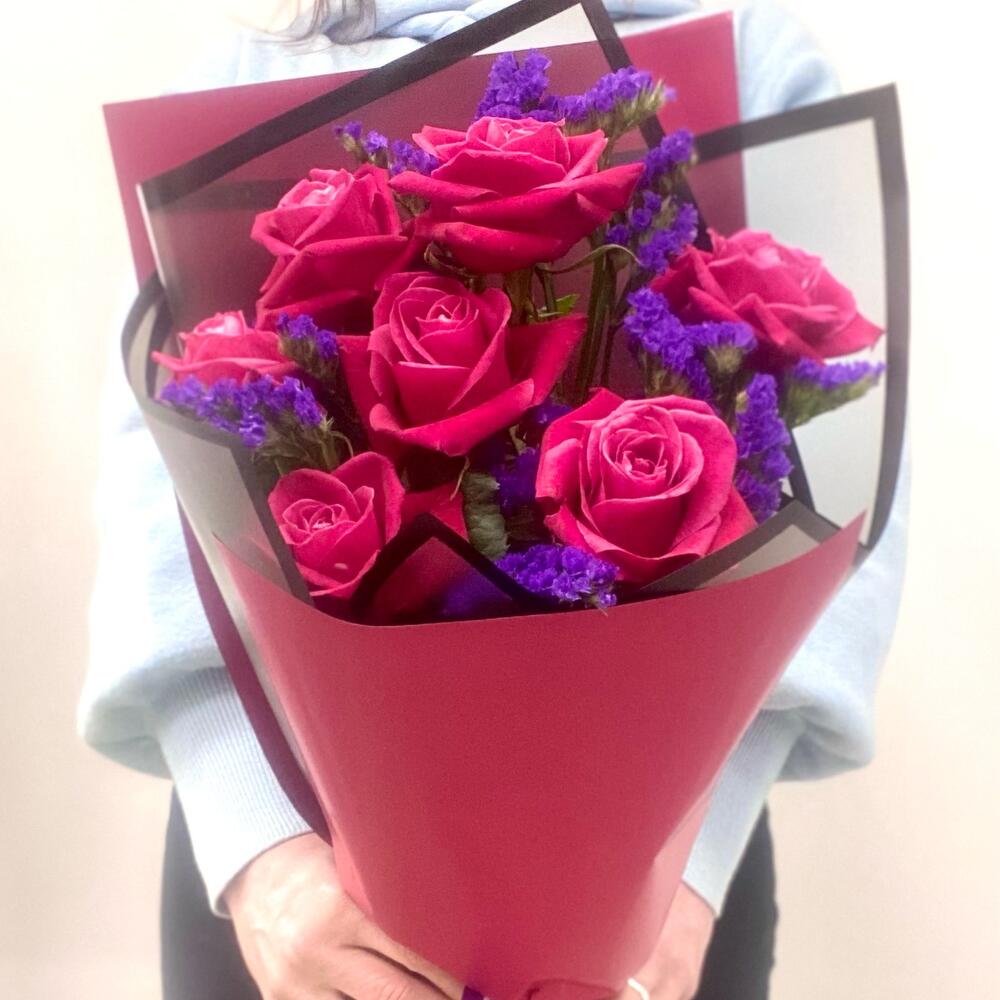 Роза – 7 шт.Статица – 2 шт.Упаковка – 2 шт.Лента – 1 шт.